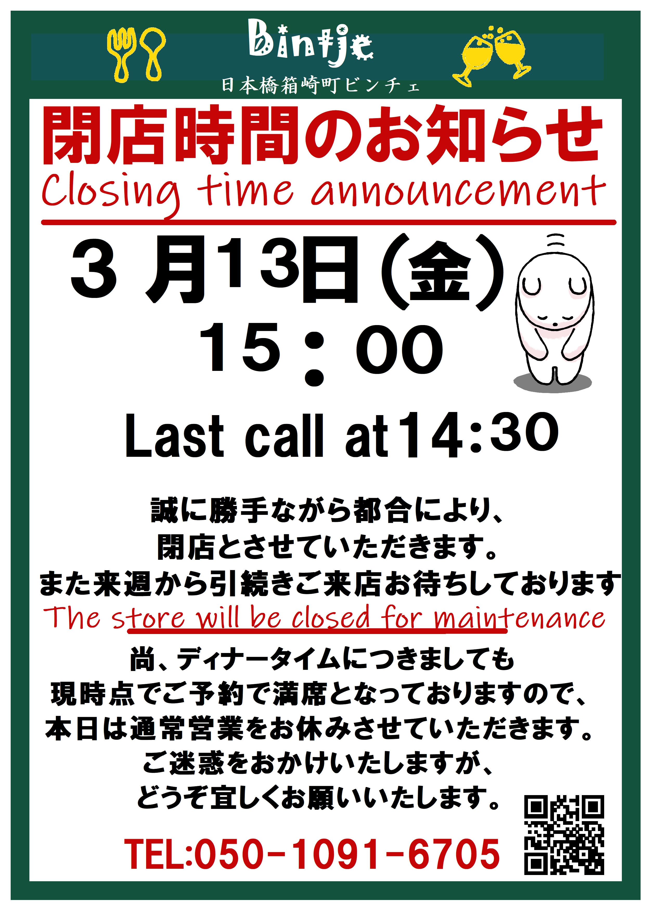 3月13日(金)につきましては、店内メンテナンスの為、